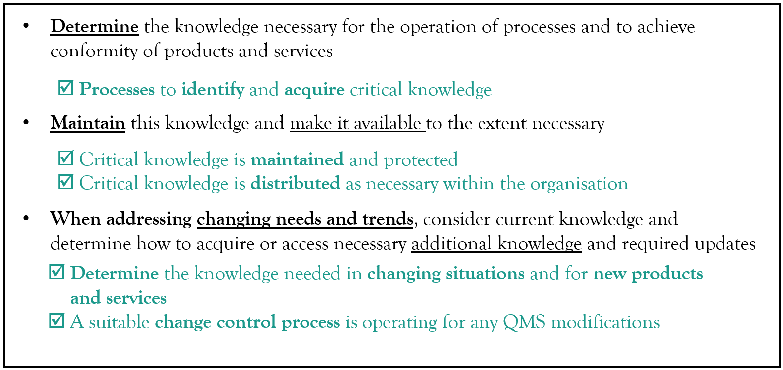 In order to effectively manage your organizational knowledge, the below model provides a structured system in order to do so, and remain in compliance with this new ISO 9001:205 requirements.